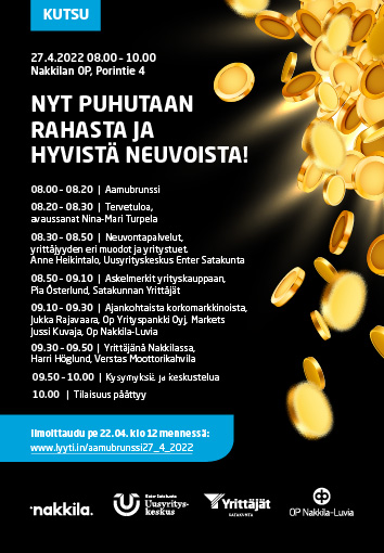 Nyt puhutaan rahasta ja hyvistä neuvoista! 27.4.2021 08.00 – 10.00 Nakkilan OP, Porintie 4 Ilmoittaudu pe 22.04. klo 12 mennessä: www.lyyti.in/aamubrunssi27_4_2022
