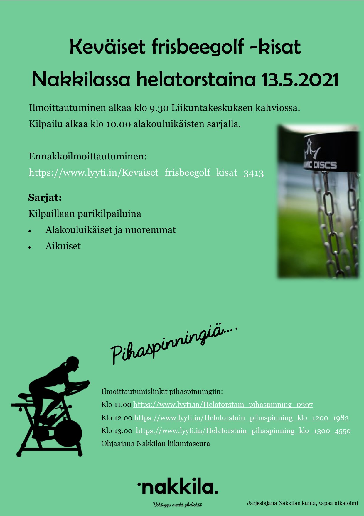 Helatorstaina 13.5. Nakkilan liikuntakeskuksen frisbeegolf-radalla järjestetään keväiset frisbeegolf-kisat.