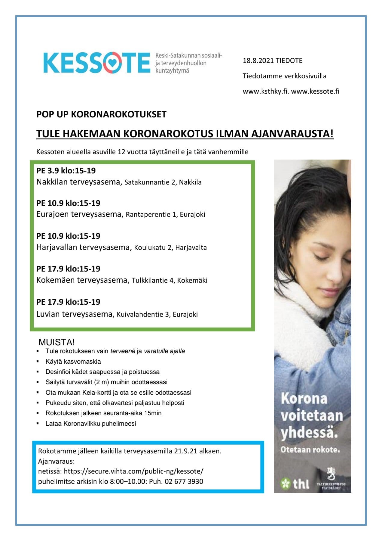 Pop up koronarokotukset alkavat kessotella. Nakkilan terveysasemalla annetaan rokotuksia ilman ajanvarausta perjantaina 3.9 klo 15-19. Nakkilan terveysaseman osoite on Satakunnantie 2.