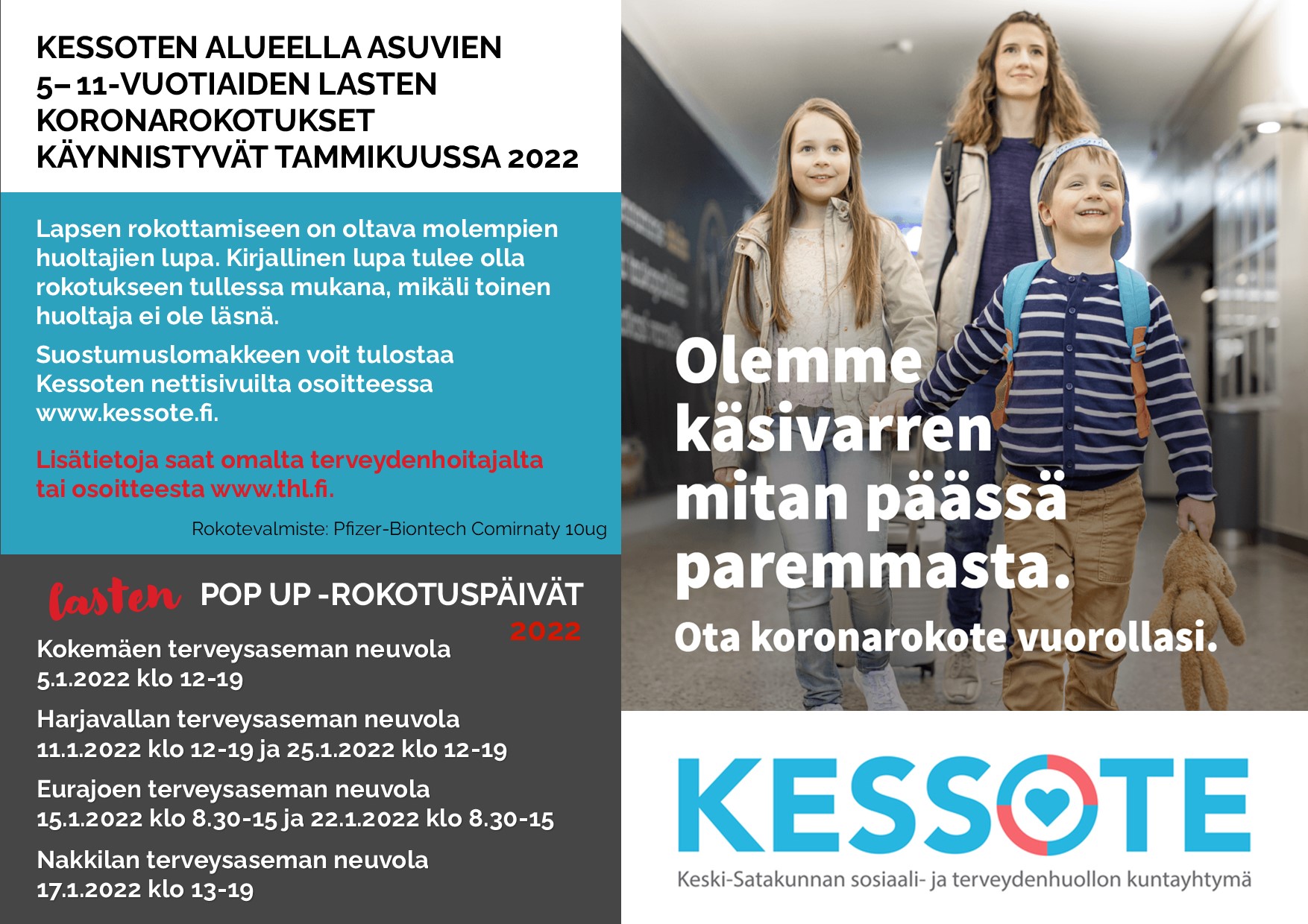 Kessoten alueella asuvien 5– 11-vuotiaiden lasten koronarokotukset käynnistyvät tammikuussa 2022. Lapsen rokottamiseen on oltava molempien huoltajien lupa. Kirjallinen lupa tulee olla rokotukseen tullessa mukana, mikäli toinen huoltaja ei ole läsnä.