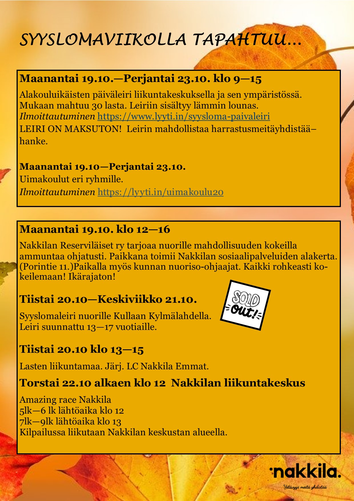 Nakkilan kunnan vapaa-aikatoimi järjestää monipuolista syysloma-ohjelmaa lapsille ja nuorille viikolla 43. Tutustu ohjelmaan ja tule mukaan!