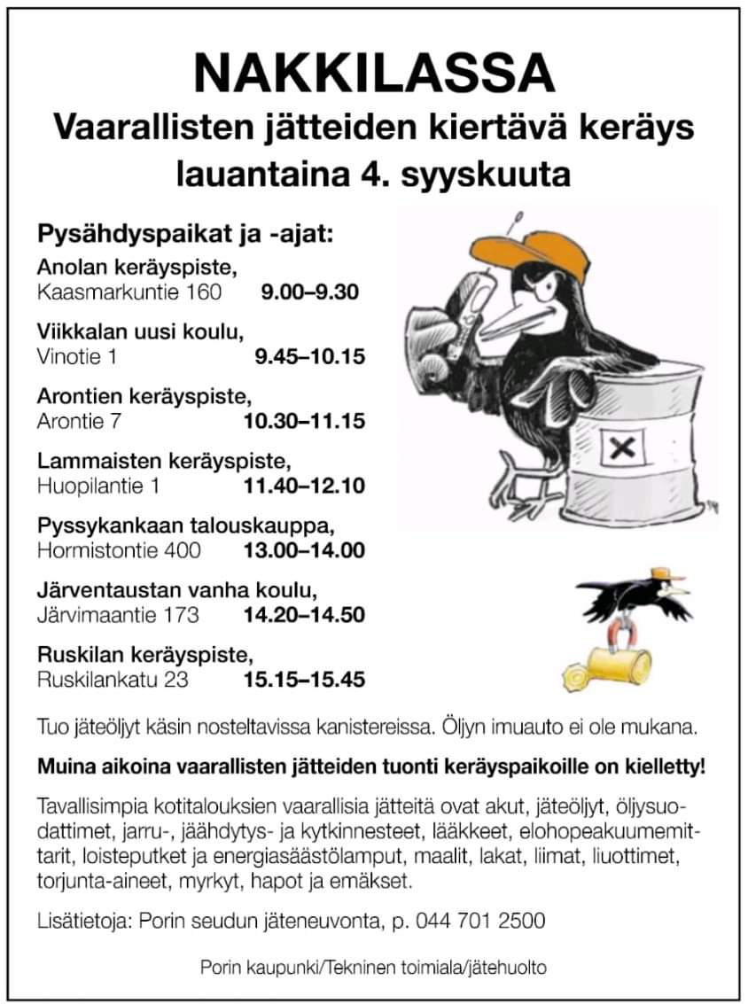 Nakkilassa vaarallisten jätteiden kiertävä keräys lauantaina 4.syyskuuta 2021. Pysähdyspaikat ja -ajat tästä